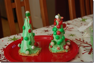 So you put a waffle cone upside down on a cookie, Ice it with green icing and then Decorate with Candy. The kids had so much fun decorating their trees. And of course there was lots of sampling going on.